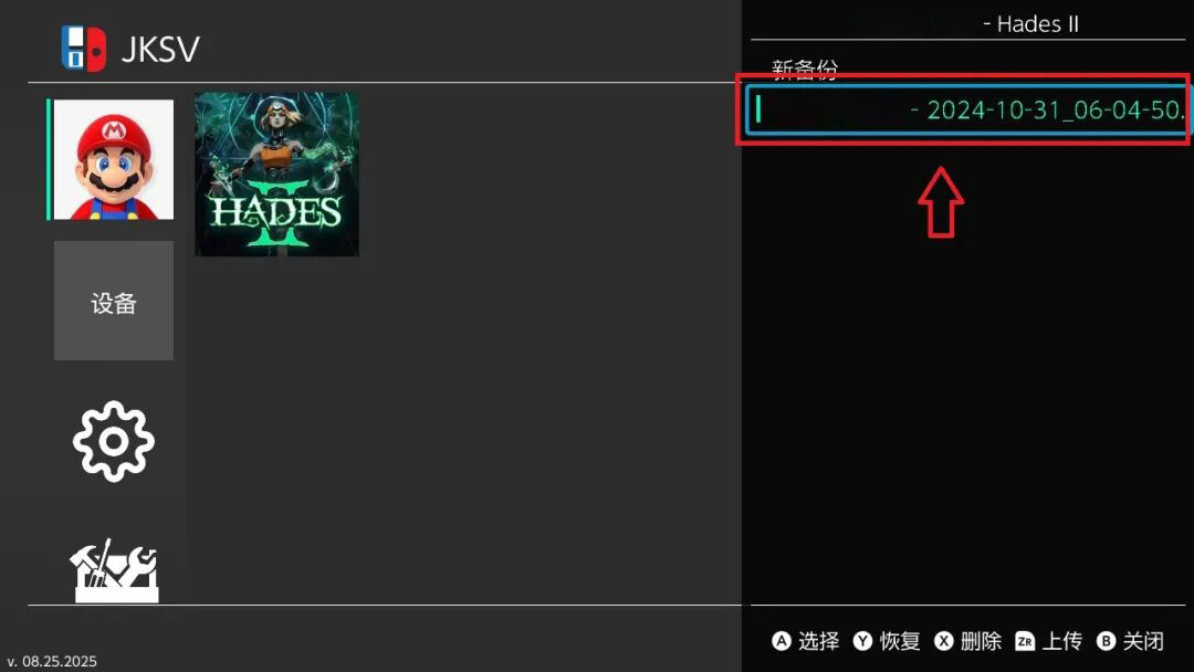 注意:如果备份出现错误提示,重启后在主页进高权限模式操作:打开hbmenu或按住R进入任意游戏,再打开JKSV工具